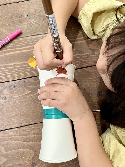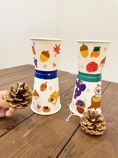 紙コップに松ぼっくりが入るとカポッ‼︎と音がして、