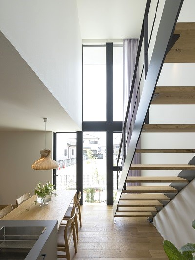 まずは、吹抜け + 床から天井までの連想窓 + 鉄骨階段 の
