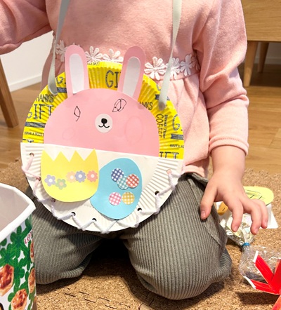 今月の見守りスペースでは、イースターのショルダーバッグを作りました。
